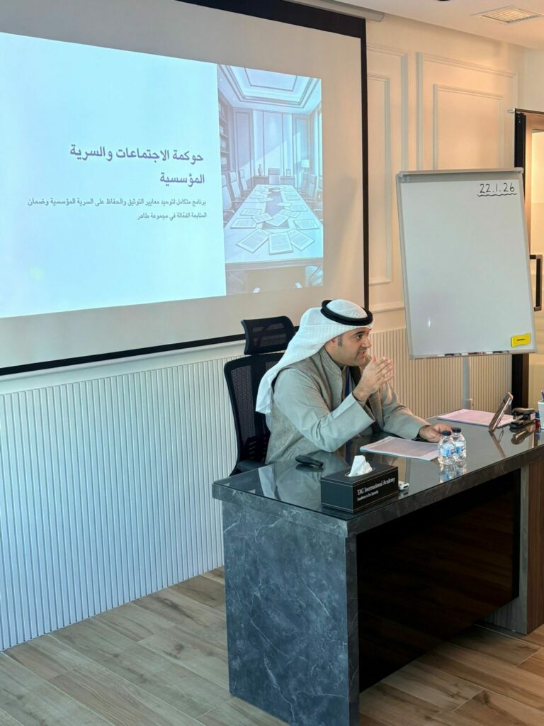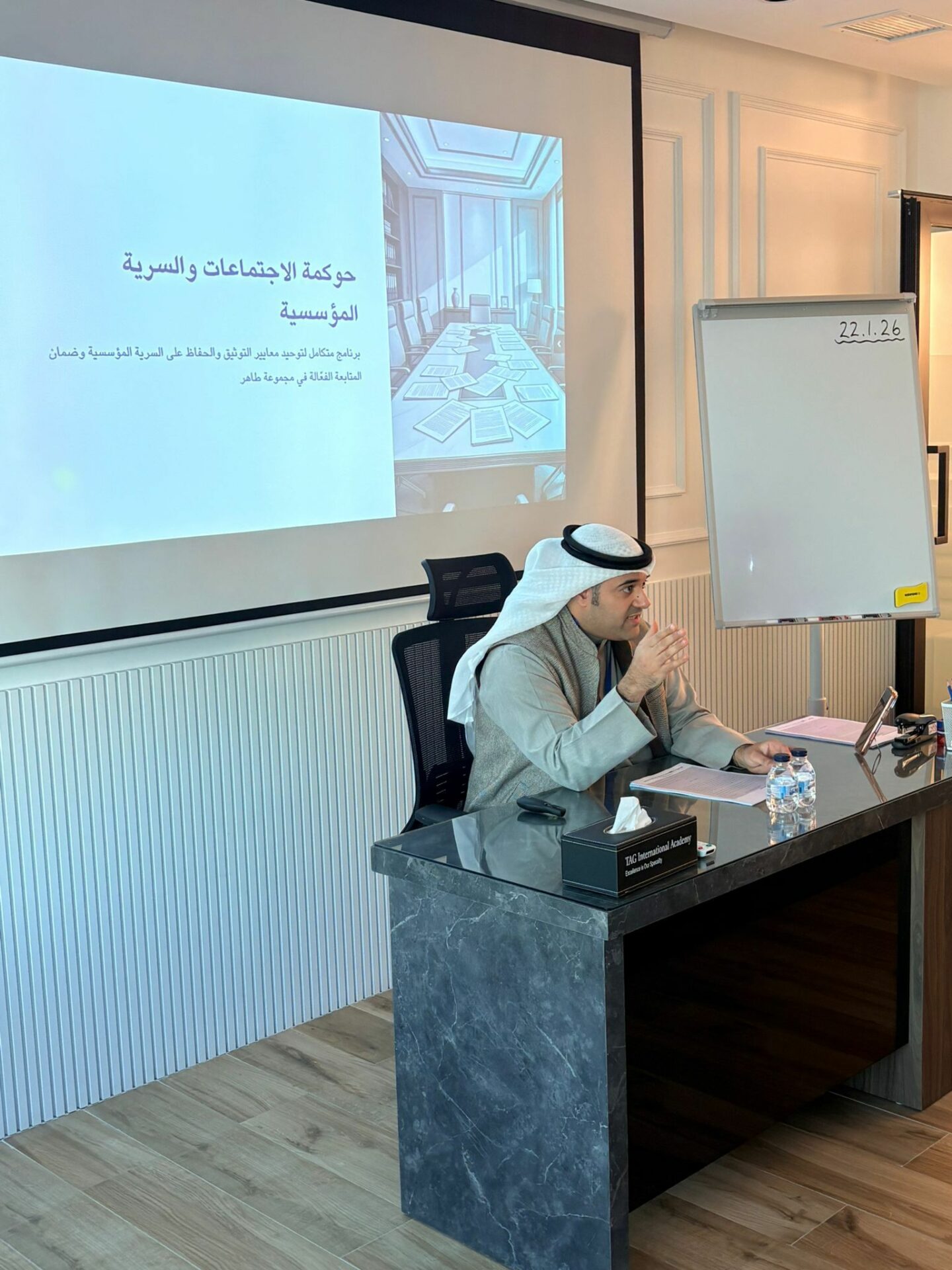 وجاء البرنامج بعنوان الاجتماعات توثيق العمل، والسرية المؤسسية، وقدمه د. فواز خالد الخطيب الشريك الإداري، حيث ركز على أفضل الممارسات المهنية في إدارة الاجتماعات وتوثيق مخرجاتها، وترسيخ السرية المؤسسية على مستوى مختلف الإدارات.