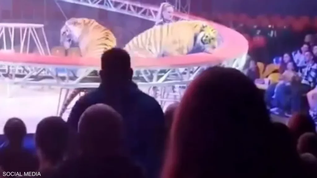 وبدأ المشهد، الذي انتشر على نطاق واسع عبر الإنترنت، بعرض 3 نمور تقف على كراسٍ، بينما تتجول المروضة ومساعدها على خشبة المسرح، وتفصلهم عن الجمهور شبكة دائرية.